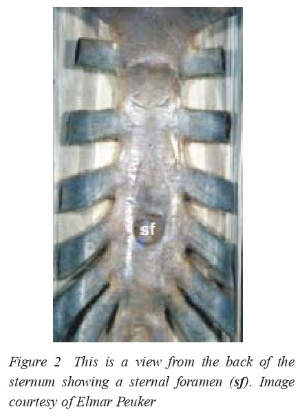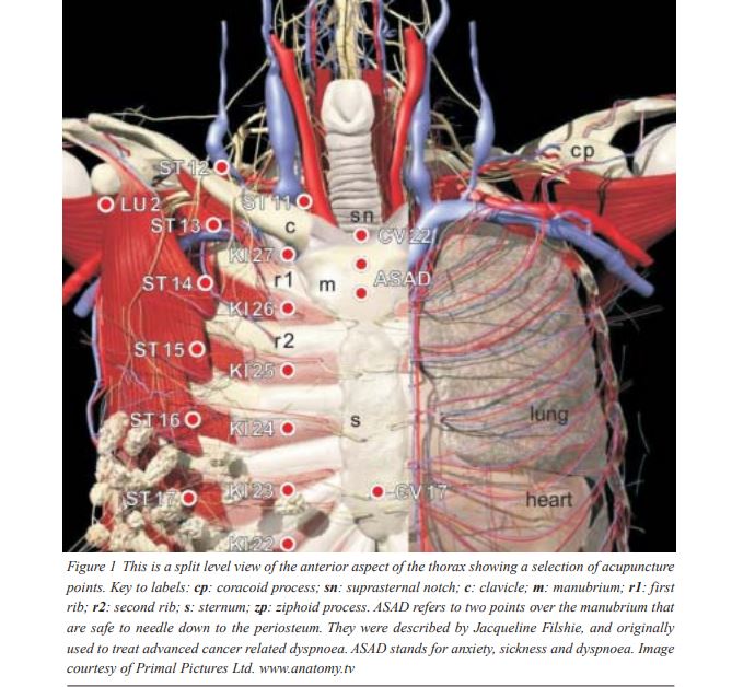 referred to as the sternal foramen, and results from incomplete fusion and ossification of the sternal plates. It is usually located at the level of the fourth intercostal space (i.e. precisely at the acupuncture point CV17, Dan Zhong). This common defect varies from incomplete formation of the sternal cortex to complete foramina, and very rarely to sternal clefts. It cannot be reliably detected by palpation because tendon fibers, thin connective tissue, or bone lamella, may conceal the foramen. In the scientific literature there are eight cases of injuries to the heart and the pericardium attributed to acupuncture.1 Several of them were caused by lack of awareness of the sternal foramen. Needling of CV17 should be performed obliquely at about 30 degrees to the sternum in a cephalic orientation.