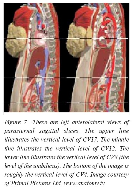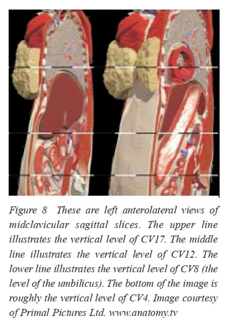 The intercostal nerves and vessels run at the lower border of the ribs, between internal and the innermost muscle layer. The pleural projection onto the thoracic wall is as follows: starting about 2cm above the sternoclavicular joints the right pleura reaches the midline at the height of the sternal angle. It runs down to the xiphoid process and then along the costal margin to the 10th rib in the mid axillary line. It crosses the 12th rib in the paravertebral line. The border of the left pleura is quite similar with one exception: at the height of the 4th intercostal space it deviates from the midline due to the position of the heart. The most forgotten detail about pleural projections is the fact that pleura (and lung) can be found above the rib cage and the clavicle. In this context the acupuncture points ST11 and 12 should be mentioned. Pneumothorax, which is definitely the most frequently reported serious injury caused by acupuncture, is a potential risk when needling these points. Pneumothorax has mostly occurred when needles are placed in parasternal or supraclavicular points (for example, when treating lung conditions). However, acupuncture to the paravertebral, infraclavicular, and lateral thoracic regions, widely used to treat muscle pain, may also cause injuries to pleurae and lungs. Descriptions of more than 100 such incidents can be found in scientific publications; in two cases, the incidents resulted in death. Pneumothorax is a preventable and potentially serious adverse event; avoiding it requires a clear understanding of the actual position and borders of the pleurae and lungs, and the thickness of the soft tissue covering them.