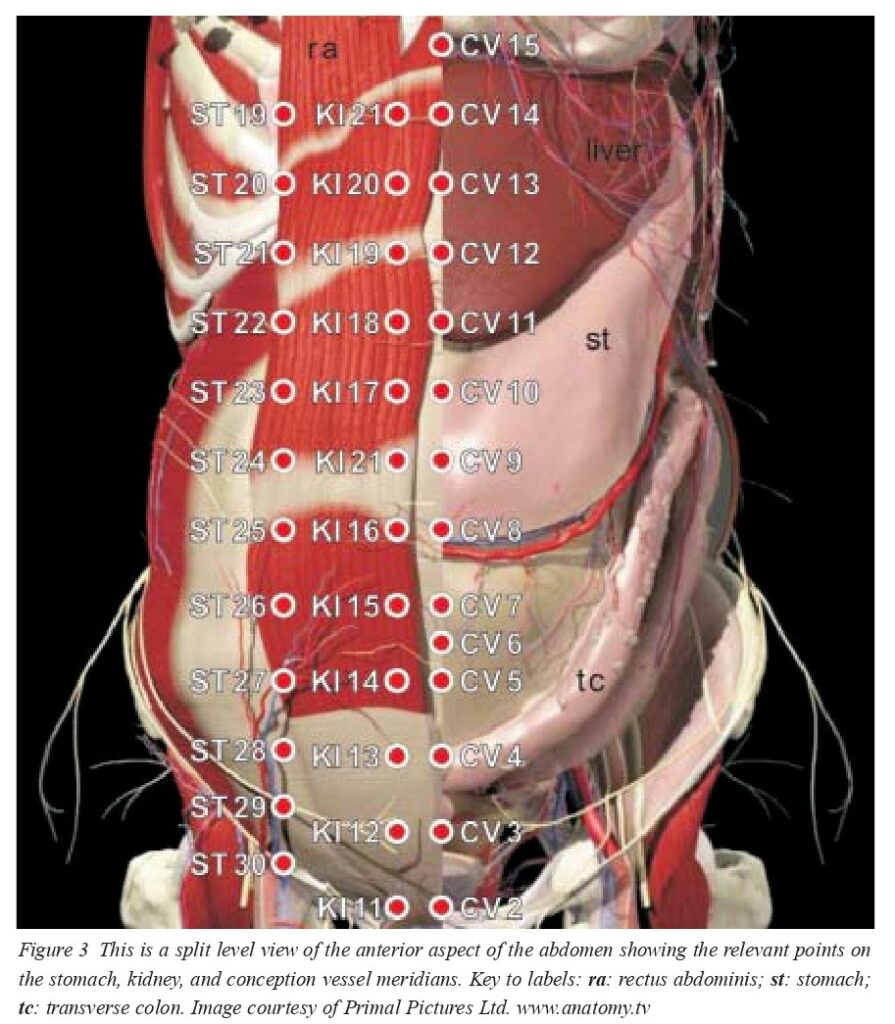 In the midline the conception vessel takes its course, with the points CV2-15 overlaying the abdominal region, over the linea alba. The kidney meridian runs almost parallel to the midline in its abdominal part. The points KI11-21 overlay the rectus abdominis muscle. The abdominal part of the stomach meridian lies a little bit more lateral