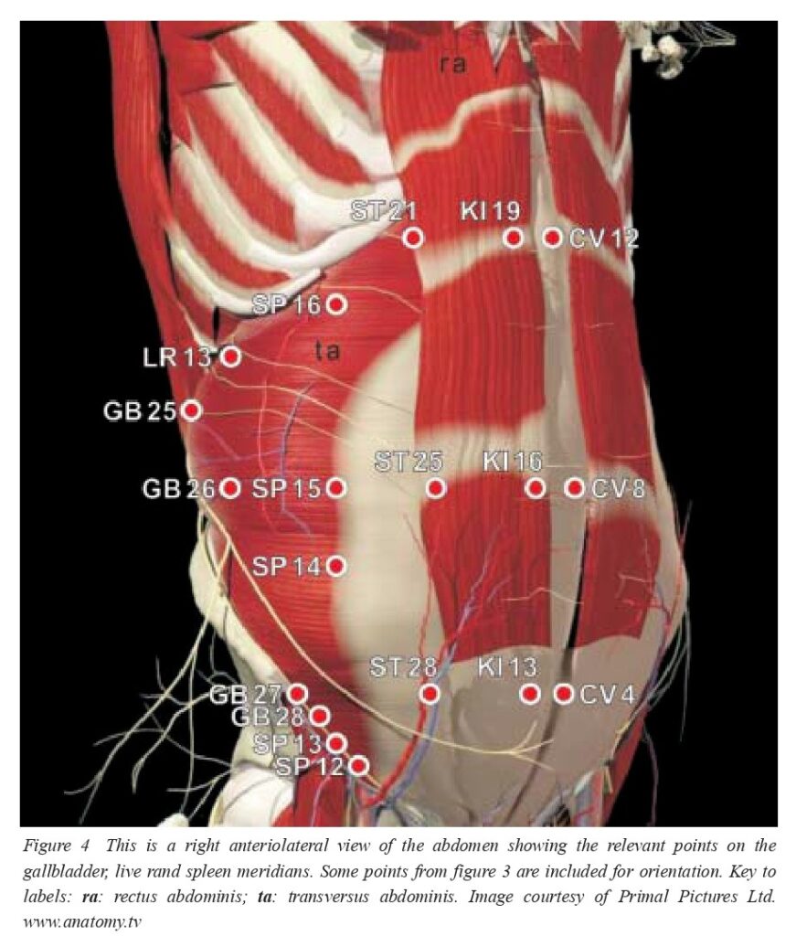 than the kidney meridian. The points ST19-30 overlay the oblique and the transverse muscles of the abdomen (or the transition of their aponeurosis into the rectus sheath).